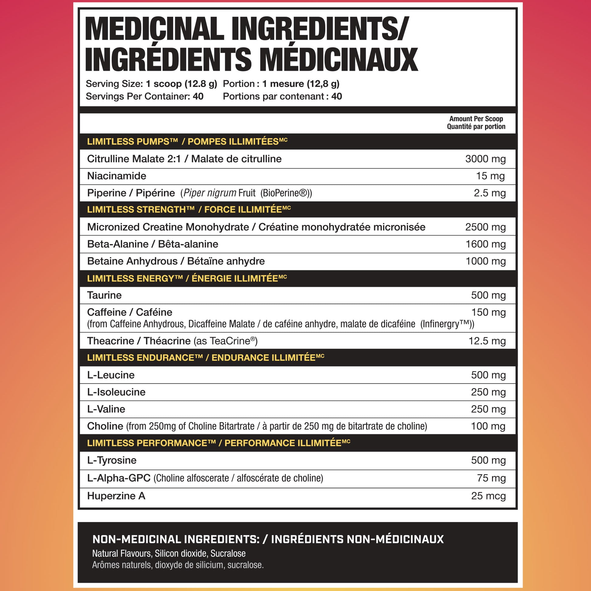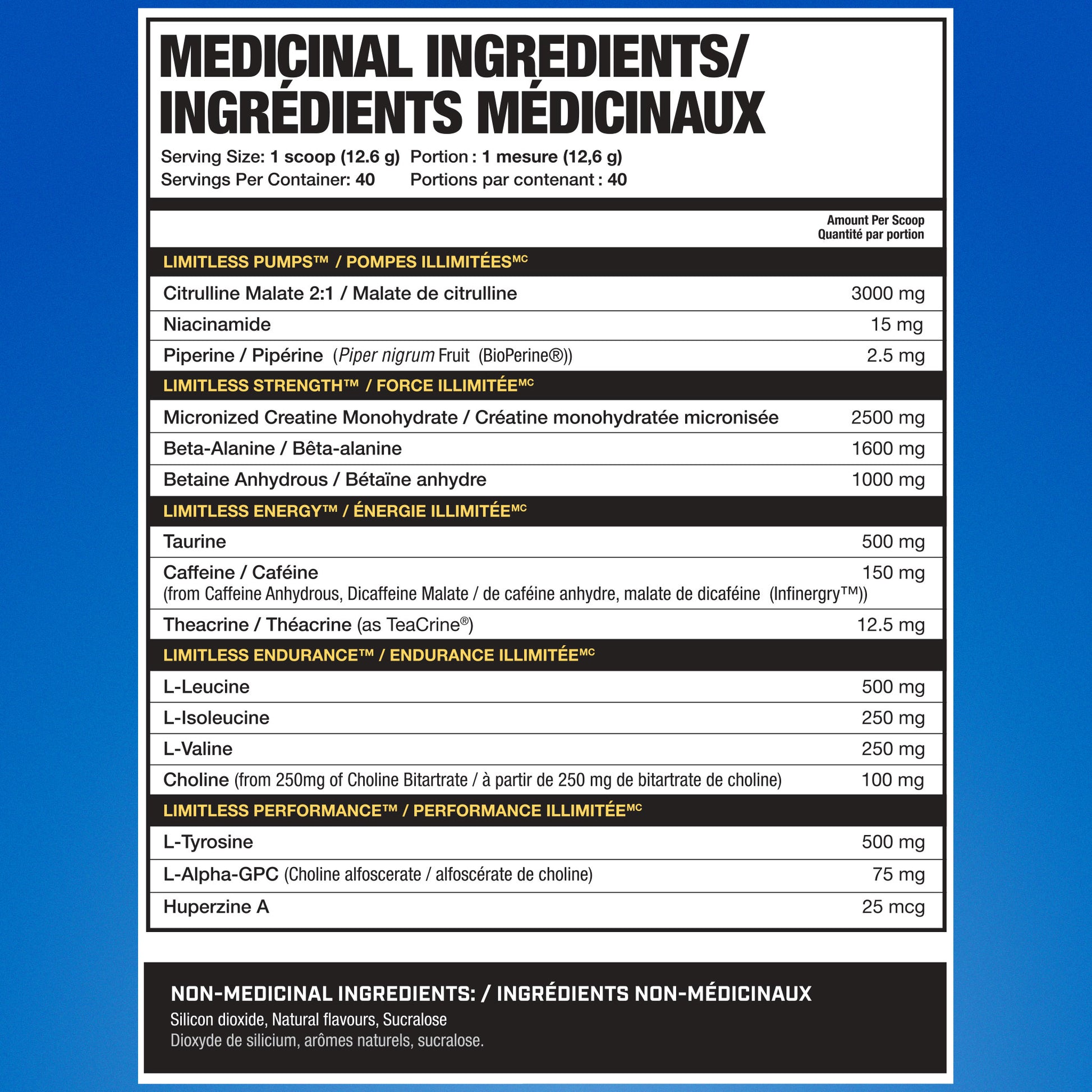 Citrulline Malate 2:1, Niacinamide, Piperine, Micronised Creatine Monohydrate, Beta-Alanine, Betaine Anhydrous, Taurine, Caffeine, Theacrine, L-Leucine, L-Isoleucine, L-Valine, Choline, L-Tyrosine, L-Alpha-GPC, Huperzine A.